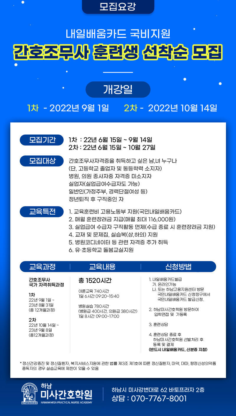 °í¿ë³ëµ¿ºÎ ±¹ºñÁö¿ø °£È£Á¶¹«»ç ±¹°¡ÀÚ°ÝÃëµæ°úÁ¤ ÈÆ·Ã»ý¸ðÁý(2022³â ÇϹݱâ)